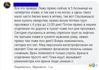 "Усе це правда! Прямо біля аптеки труп пролежав з 6:00 до 13:00! Потім прямо в нашому відділенні дорогою в туалет теж пів дня пролежав. На третьому поверсі в туалеті чоловік помер, лежав там теж пів дня!!! Вчора познайомилися – сьогодні його немає. Медперсоналу катастрофічно не вистачає", – написала одеситка Лариса.