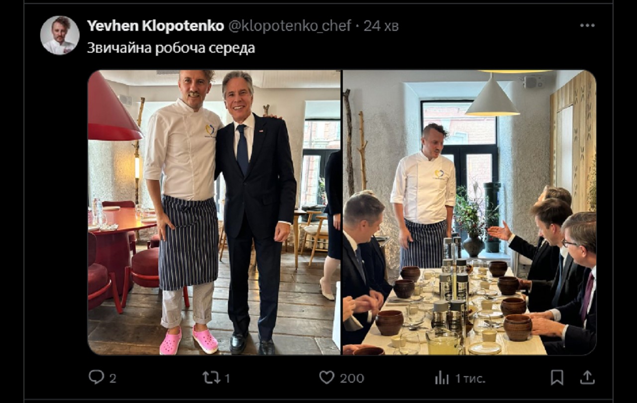 Шеф-кухар Євген Клопотенко повідомив, що в одному з ресторанів його мережі обідав державний секретар США Ентоні Блінкен, і вони мали особисту розмову.