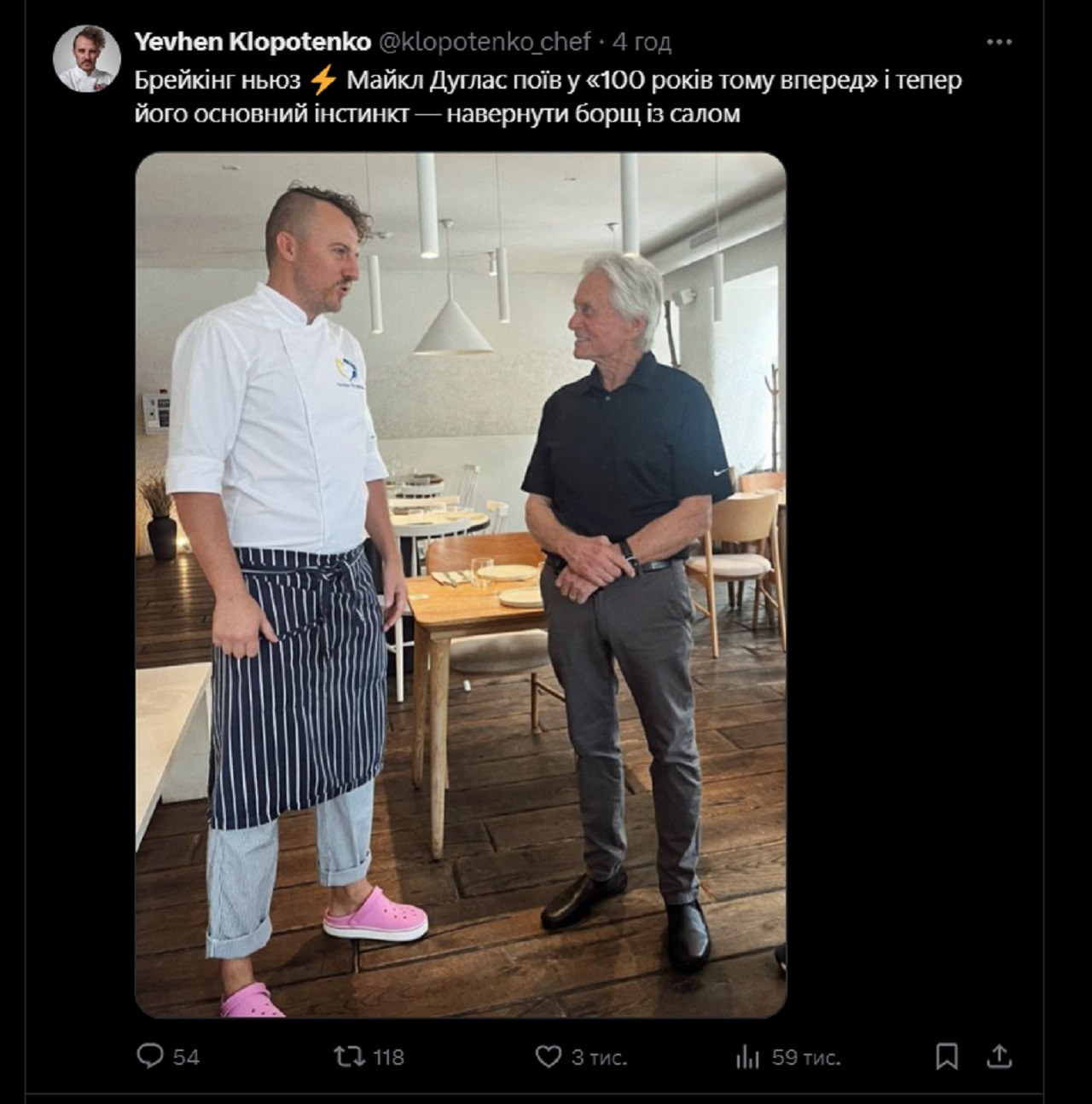 А до цього заклад Клопотенка відвідав голлівудський актор Майкл Дуглас, і за словами шеф-кухаря, куштував там борщ, який йому сподобався.