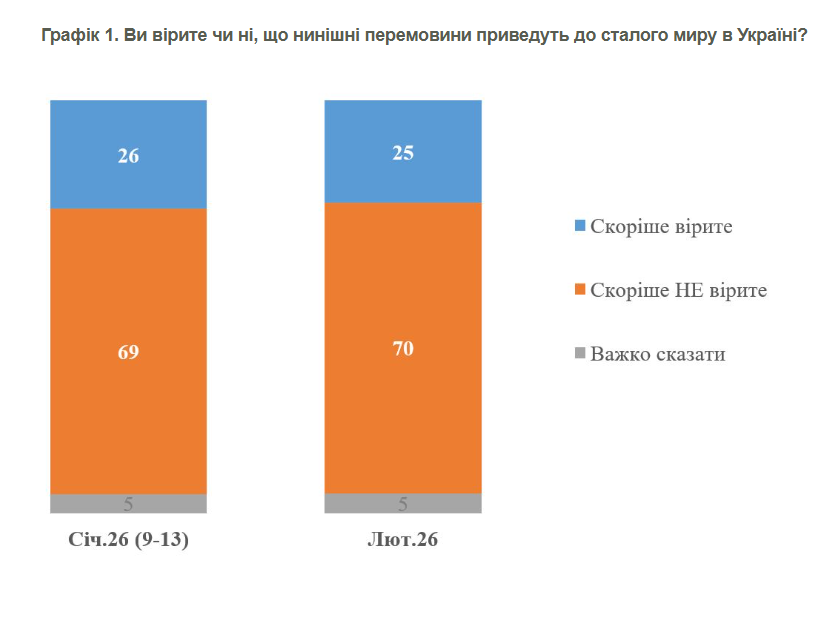 Згідно з дослідженням, "переважна більшість українців – 70% – не вірять, що нинішні перемовини приведуть до сталого миру".