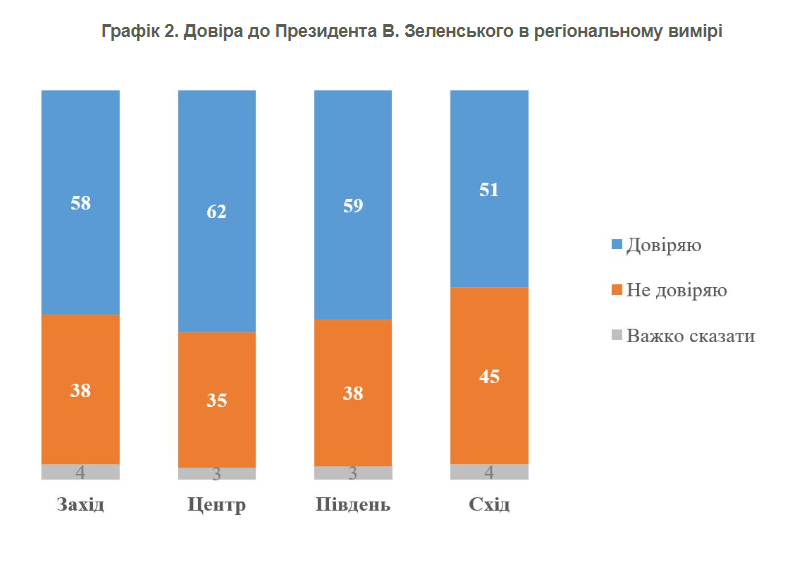 "У всіх регіонах України ситуація досить подібна і баланс довіри-недовіри – позитивний. Дещо вирізняється на тлі інших Схід, де 51% довіряють і 45% – не довіряють. В інших регіонах довіряють дещо більше – 58-62% проти 35-38%, які не довіряють", - зазначають аналітики.
