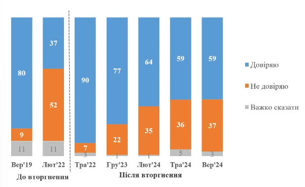 Відповідно до інфографіки, довіра до президента Зеленського у травні 2022 року становила 90% серед опитаних респондентів. У грудні 2023 року цей показник впав до 77%, а у вересні 2024 року сягнув 59%. Також 37% опитаних відповіли "не довіряю", а ще 3% зазначили, що їм важко визначитися.
