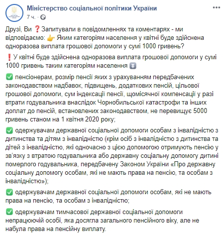 "Ви так голосно розрекламували цю тисячу, що пенсіонери дійсно чекали. Але приходить тільки пенсія, без доплат. Тоді чи говоріть про конкретні терміни виплат, або не годуйте бабульок байками", - прокоментувала користувач публікацію про те, яким категоріям населення в квітні буде здійснена одноразова виплата грошової допомоги.