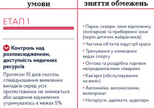 Перший етап плану передбачає, що в країні встановлено ретельний контроль над поширенням вірусу, а необхідні медичні препарати - доступні. Для початку планують відкрити парки і сквери, непродовольчі магазини, нотаріальні та адвокатські контори, деякі об'єкти індустрії краси.