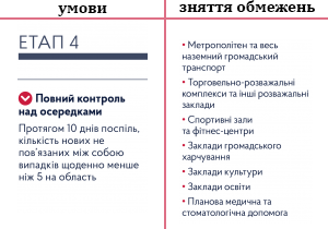 Умова для четвертого етапу - кількість нових не зв'язаних між собою випадків в межах області не більше 5, також протягом 10 днів. Це вже майже повноцінне життя: громадський транспорт, в тому числі і метро, установи культури і освіти, планова медична та стоматологічна допомога і ТРЦ вже з розважальними майданчиками.