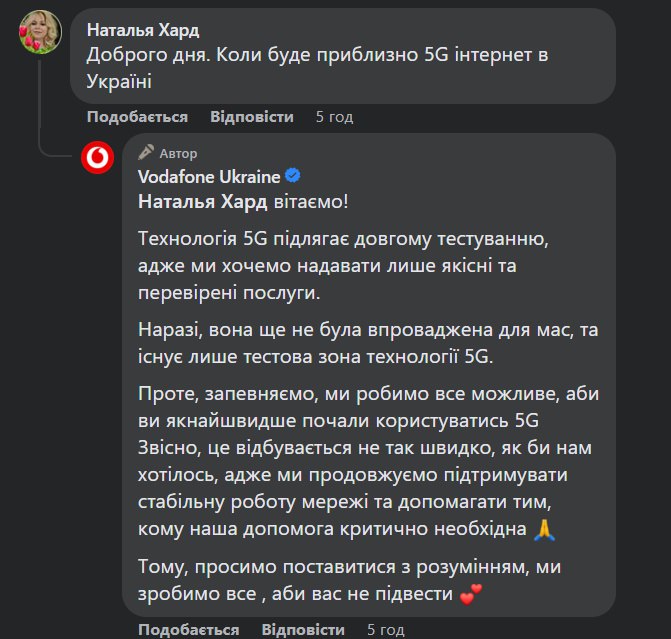 На питання жінки у Vodafone повідомили, що технологія 5G підлягає тривалому тестуванню. Наразі її не впровадили для мас, є лише тестова зона технології 5G.