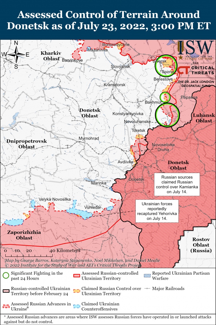 - Російські війська проводили обмежені розвідувальні операції на схід від Бахмута і продовжували обмежені наземні атаки на північний захід від Слов'янська, на схід від Сіверська та на південь від Бахмута.