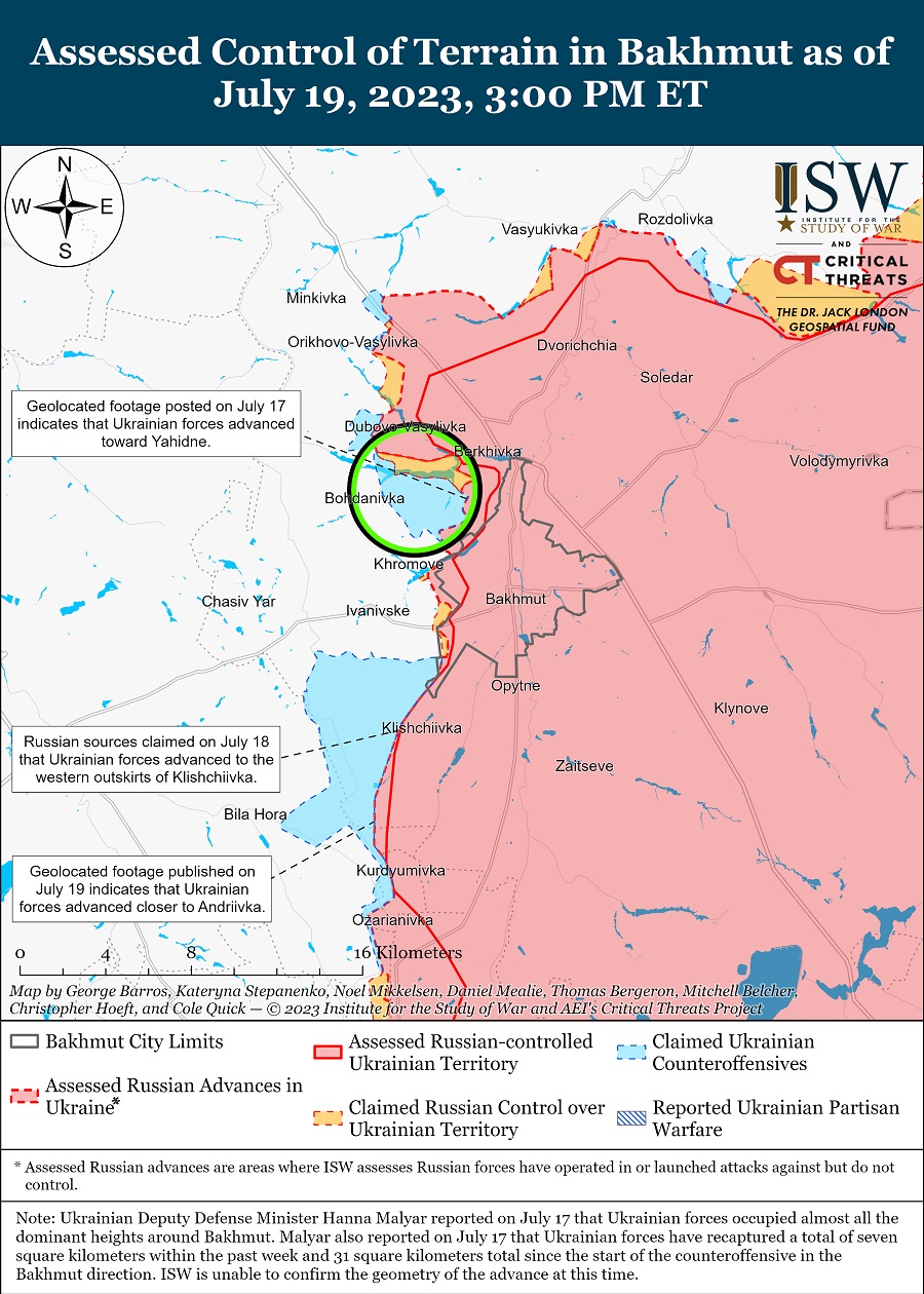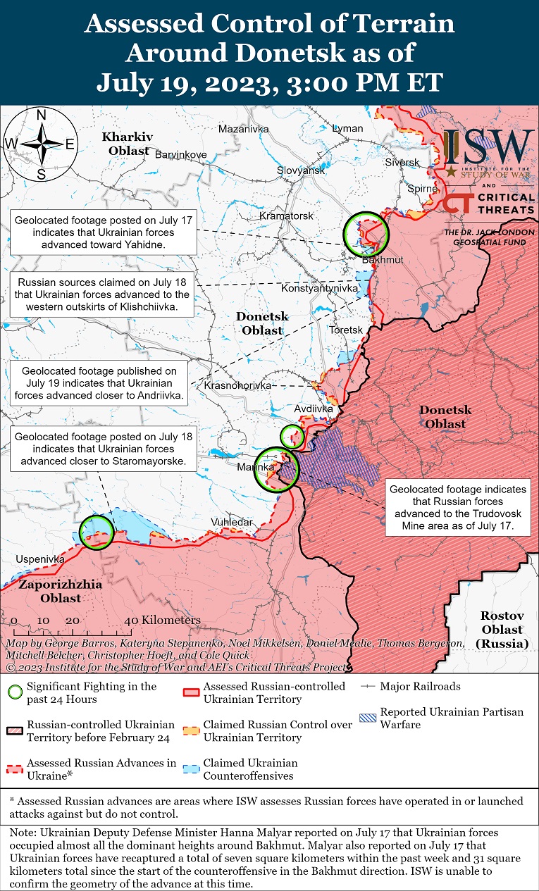 19 липня українські війська продовжували контрнаступальні дії на північному та південному флангах Бахмута, на окремих ділянках здобули успіхи. Геолокаційні кадри, опубліковані 19 липня, показують, що українські сили просувалися на захід від Андріївки.
