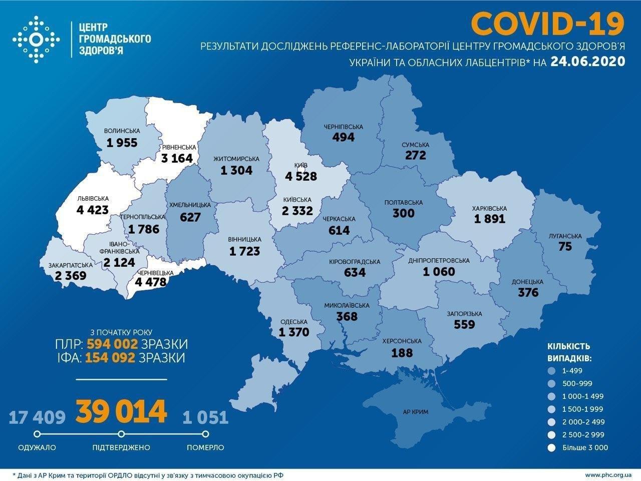 Загалом за час пандемії COVID-19 захворіли 39 014 людей, 17409 одужали (+453), 1051 летальних випадків (+16)