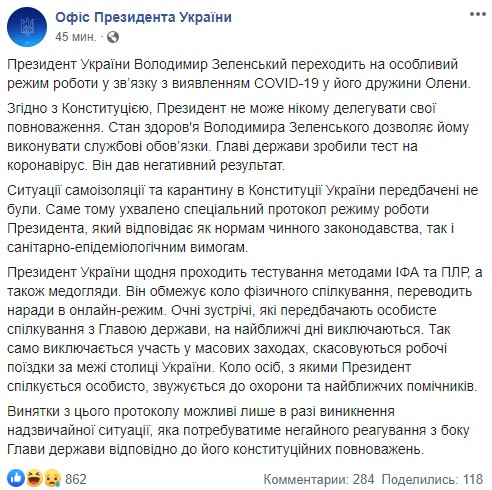 "Президент України Володимир Зеленський переходить на особливий режим роботи у зв'язку з виявленням COVID-19 у його дружини Олени", - йдеться в повідомленні.