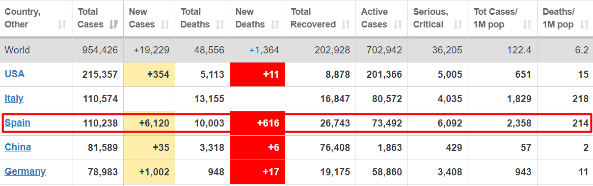 Країна досягла рекордного рівня смертей за одну добу, викликаних COVID-19, - 950 летальних випадків. У зв'язку з цим Конгрес Іспанії прийняв рішення продовжити надзвичайний стан у країні до 11 квітня.