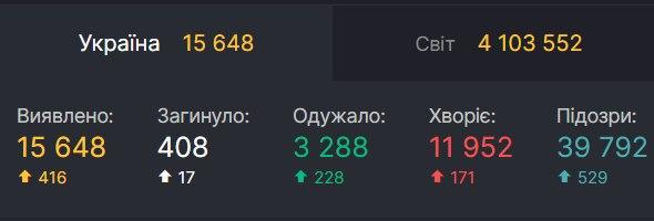 З початку пандемії коронавірус забрав життя 408 українців, 3060 осіб видужали.