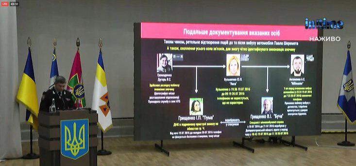 "Проведеними слідчо-оперативними заходами і подальшим документуванням групи вдалося чітко виділити тих людей, які підозрюються нами у вбивстві Павла Шеремета. Це Яна Дугаров, Юлія Кузьменко, Антоненко і подружжя Грищенко", - заявив генерал Коваль.