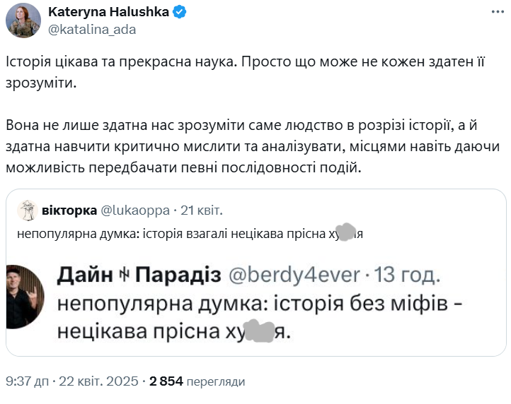 "Те що для "ху**я" ця наука, то скоріше за все причина або в тому, що вам її погано викладали, або ви просто не здатні в аналіз. До того ж історія не лише про дати та події. Це історія жінки і дитини в розрізі еволюції цивілізацій, про релігію, культуру, звичаї та купу іншого".
