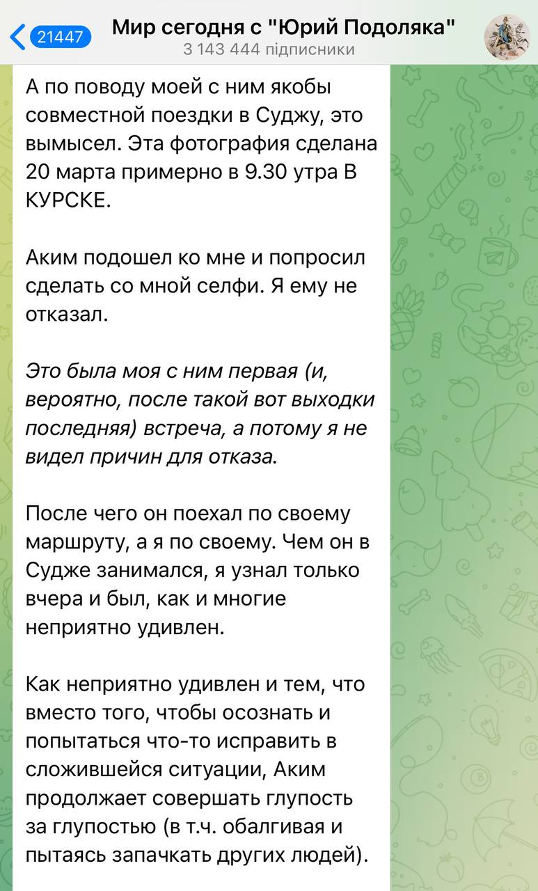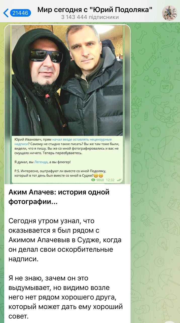 Зокрема, після того, як він виклав спільну фотографію з пропагандистом Юрієм Подолякою, той стрімко написав пост, де заявив, що Апачев йому ніхто і сфотографувалися вони випадково.