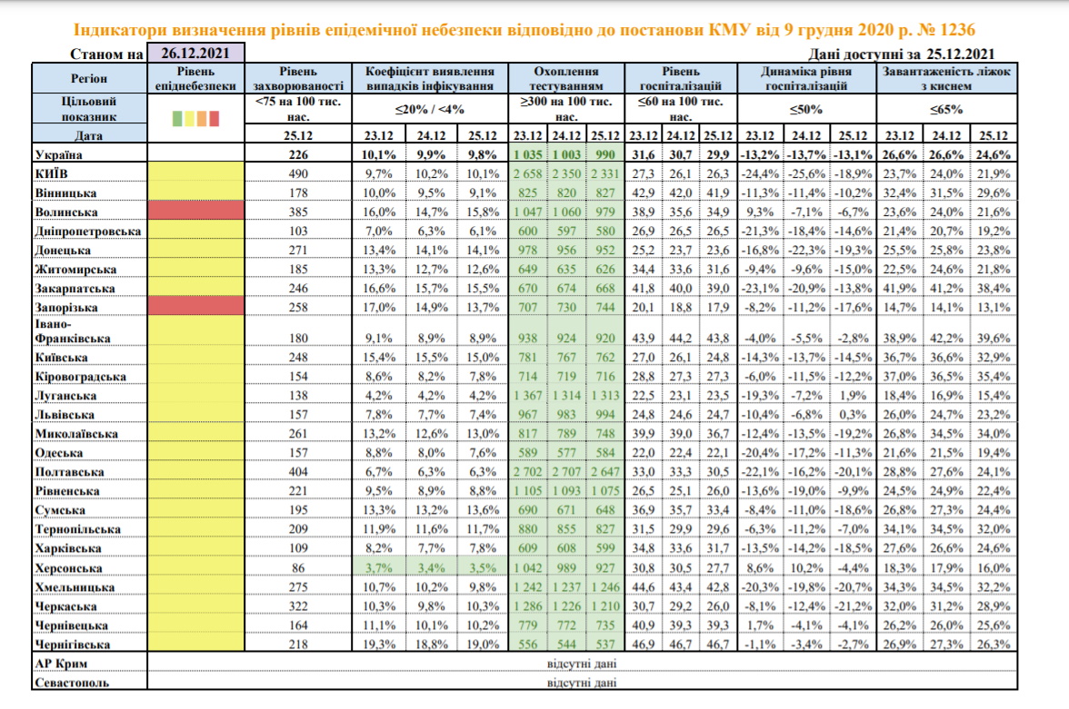 picture Таблиця даних про кількість хворих на COVID станом на 26.12.2021 Фото: МОЗ України