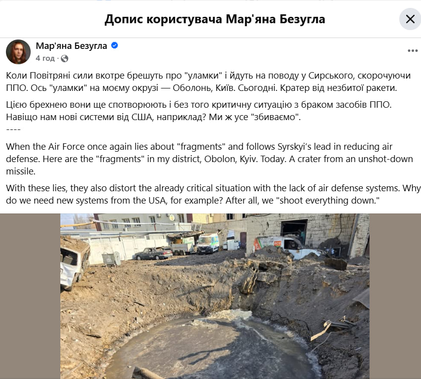 "Коли зенітний ракетний дивізіон Героя України, на рахунку якого десятки збитих балістичних ракет у небі столиці, тисячі врятованих життів киян веде бойову роботу і доповідає, що всі шість ракет знищено, то хто ви така, пані Безугла, щоб оцінювати ефективність та піддавати сумніву якість бойової роботи українських зенітників. Тим паче усі дії фіксуються об"єктивним контролем та ретельно аналізується на всіх рівнях. Хто бреше?! Фото, люб"язно надане росіянам Безуглою – це оперативний об"єктивний контроль для ворога! Ціль не уражена, а значить: "надо повторить"! Але скоріш за все їй це знову зійде з рук, як усе інше…", - припустив Ігнат.