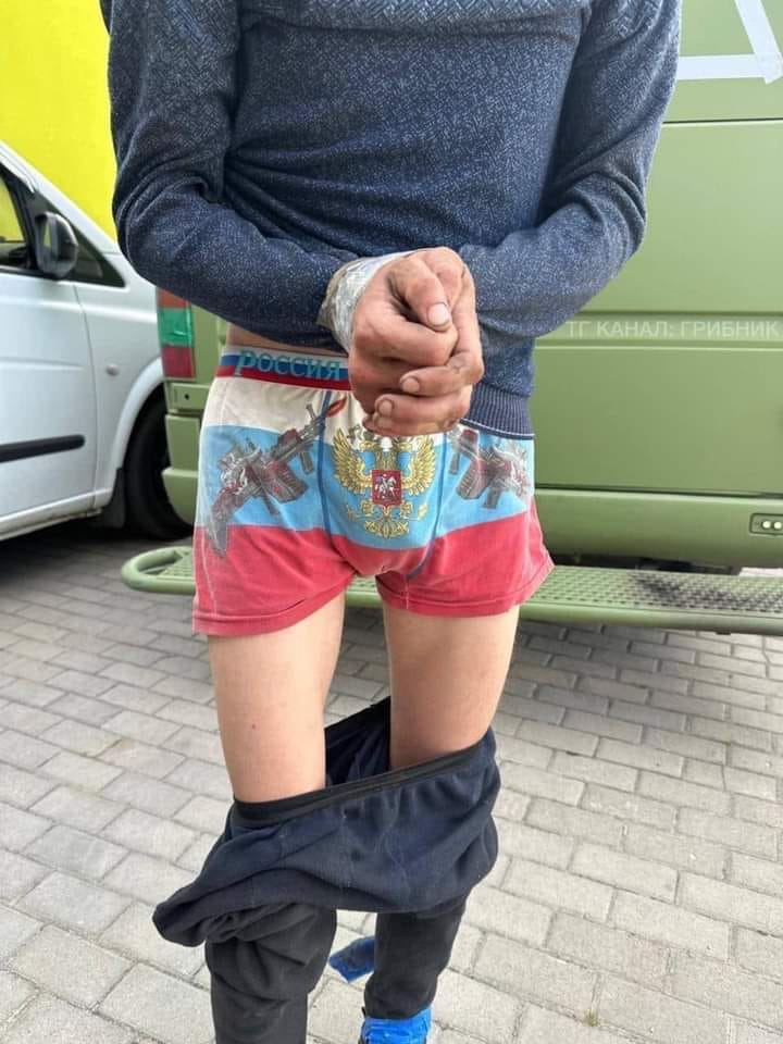 На фото полонений стоїть зі зв'язаними руками та в трусах із зображенням прапора і герба РФ.