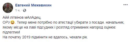 "Айй Літвінов молодец. ОРУ. Тепер мене потрібно по атестації убирати з посади. начальник, якому місце на лаві підсудних і розгляд отриманих нагород оцінює підлеглих! На початку 2019 підмінити не вдалось, чекали рік", - написав Межевікін.