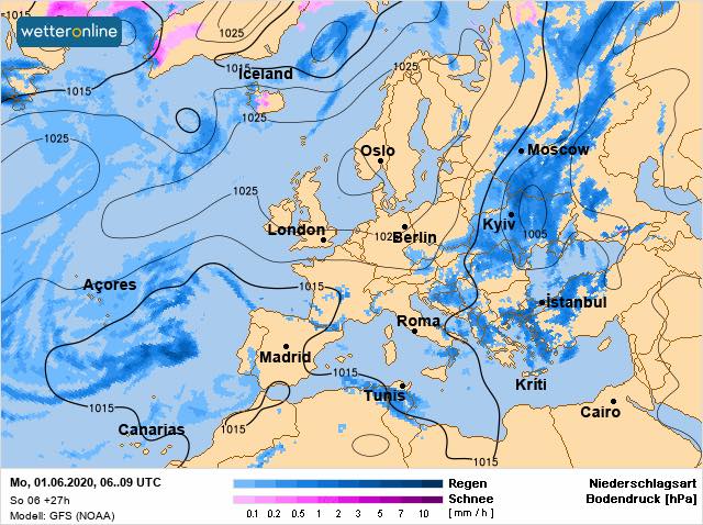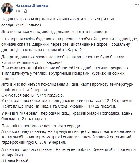 1 червня в Україні буде вогко, падатимуть дощі. Літо почнеться похолоданням, очікується вдень +9+13 градусів. У центральних областях у понеділок передбачається +12+18 градусів. Найтепліше буде на півдні та сході України: +17+22 градуси.