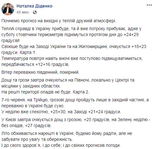 Про це повідомляє синоптик Наталія Діденко на своїй Facebook-сторінці.