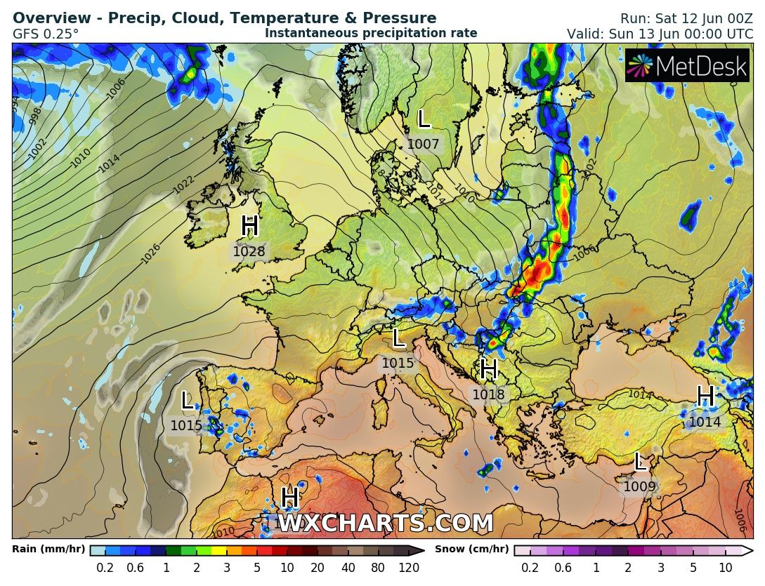 До України 13 червня прийде холодний атмосферний фронт. Таким чином, на деяких областях країни будуть зливи, град, грозові дощі, що супроводжуватимуться похолоданням.