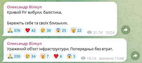 "Кривий Ріг. Вибухи, балістика. Бережіть себе та своїх близьких", — йдеться у повідомленні.