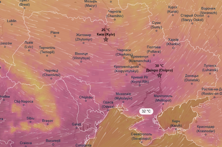 А вже 26-27 червня прийде різке похолодання – через проходження холодного фронту температура знизиться до +14…+21 °C. Пройдуть дощі.
