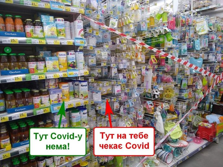 "Тут Covid немає", - вказує стрілочка на частину стелажа з дитячим харчуванням.