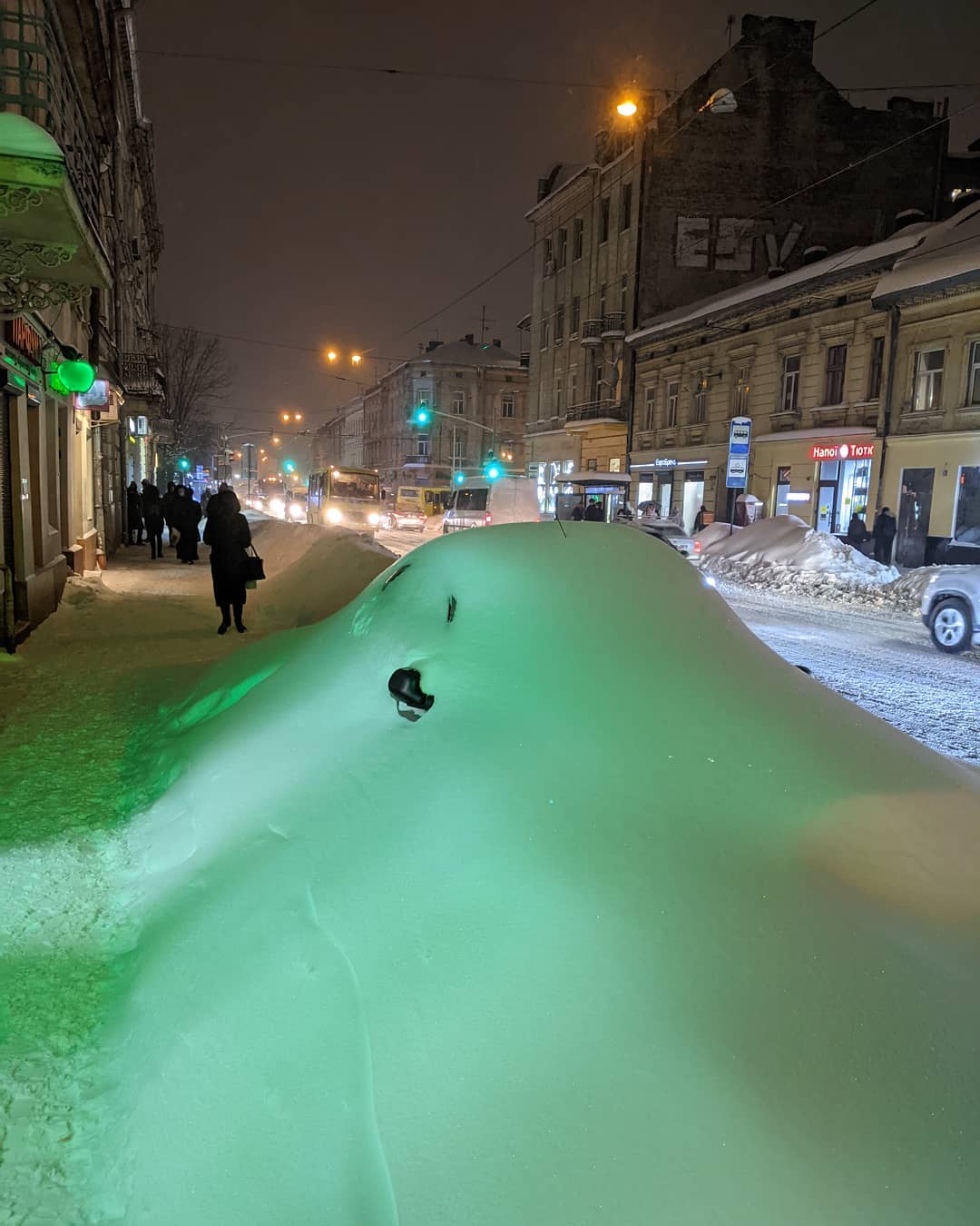 Після тривалих і рясних снігопадів, які приніс в Україну циклон, на вулицях Львова утворилися величезні замети, під деякими з них виявилися припарковані на узбіччях автомобілі.