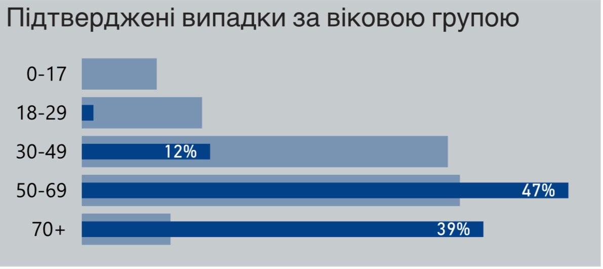 Найбільше летальних випадків серед хворих на коронавірус було зафіксовано у пацієнтів у віці від 50 до 70 років - 47 відсотків. На другому місці (39%) - люди більш похилого віку 70+.