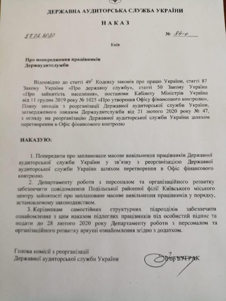Голова комісії з реорганізації Ігор Буграк 27 лютого підписав наказ про масове звільнення співробітників Державної аудиторської служби.