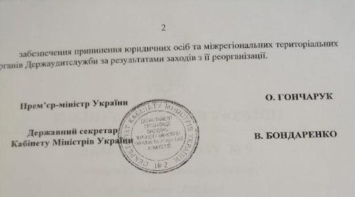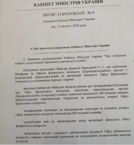 На підставі пропозицій Маркарової прем"єр-міністр Олексій Гончарук підписує доручення від 20 жовтня 2019 року щодо забезпечення скорочення штатної чисельності працівників органів Держаудитслужби на 30 відсотків.