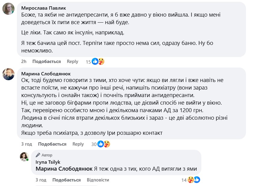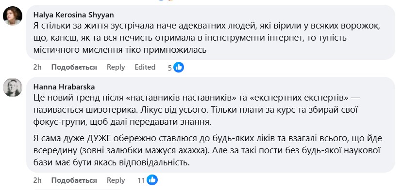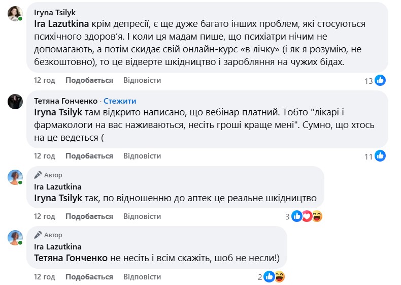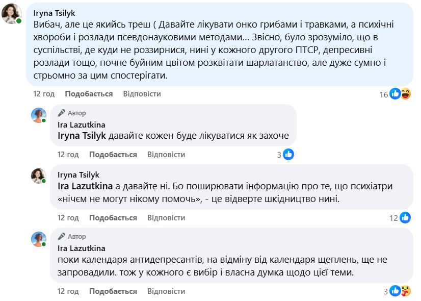 "Я, звісно, розуміла, що у суспільстві, де в кожного другого зараз ПТСР, депресія та інші психічні розлади, буйним цвітом розквітнуть різні шарлатанські практики для їхнього "лікування", але чомусь неймовірно сердить, коли мої френди на повному серйозі поширюють пости про те, що психіатри - це зло, таблетки - це зло, і давайте краще вірити в різні псевдонаукові методи.