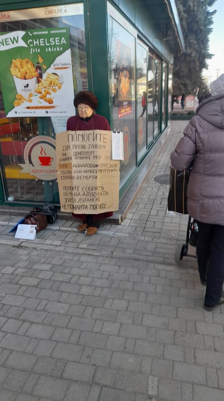 У соцмережах з'явився знімок з окупованого Луганська, де видно як літня жінка просить у перехожих гроші на пошуки могили сина, якому бійці батальйону "Айдар" нібито відрізали голову в серпні 2014 року.