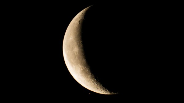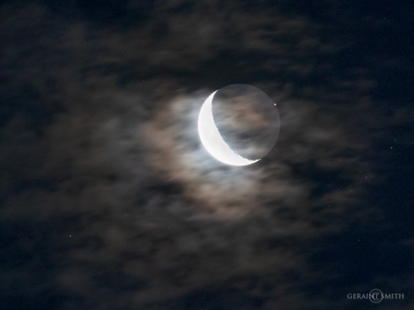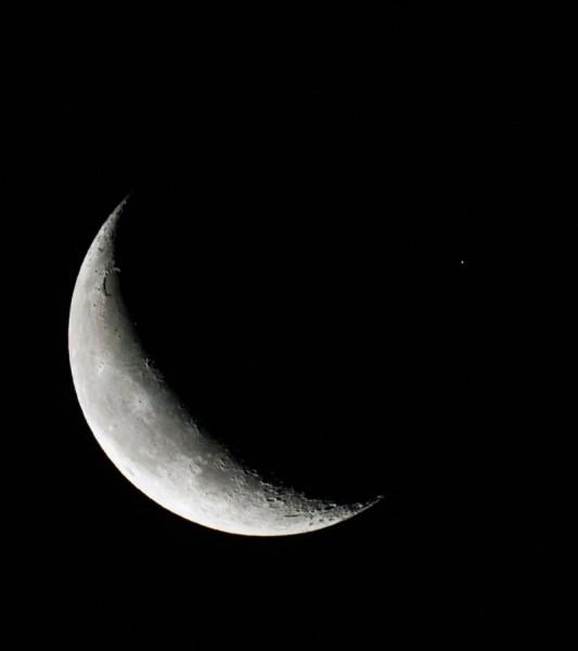 На цій фотографії планета виглядає як маленька оранжева цятка, яка ледь торкається нижнього освітленого краю Місяця.