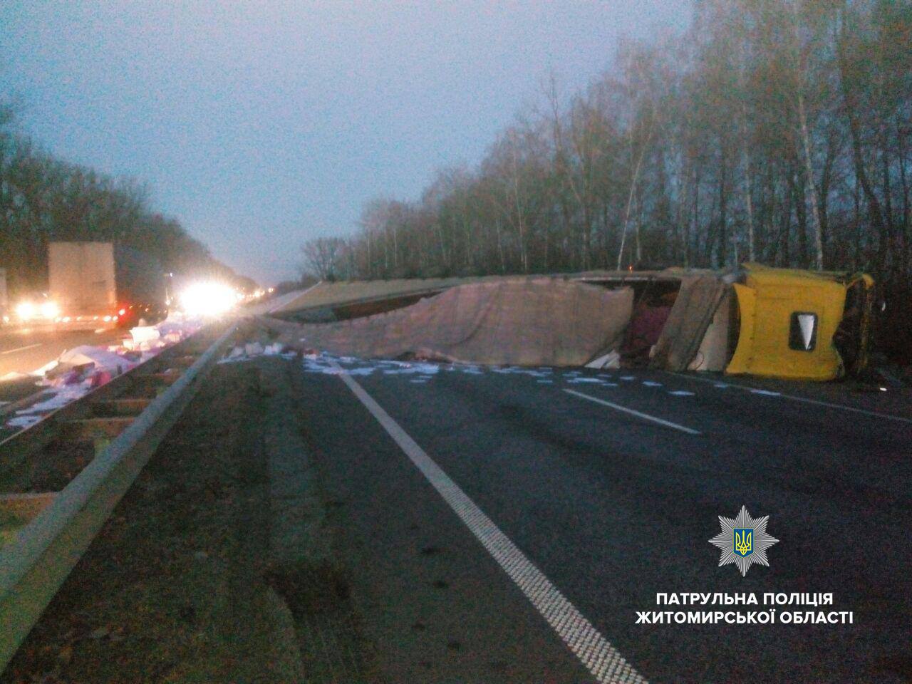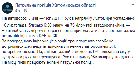 "На автодорозі "Київ-Чоп" ДТП, рух в напрямку Житомира ускладнено. 16 листопада, близько 6:30 ранку, на 75 кілометрі автодороги "Київ-Чоп" відбулась дорожньо-транспортна пригода за участі двох вантажних автомобілів, а саме DAF та ЗіЛ", - йдеться у повідомленні.