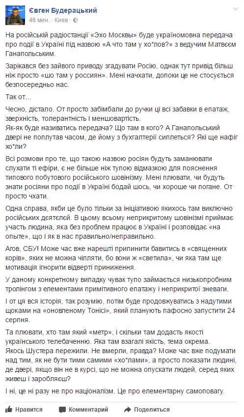 Користувачів українського сегменту соціальних мереж обурила звістка про те, що на радіостанції "Ехо Москви" виходитиме програма "Шо там у них".