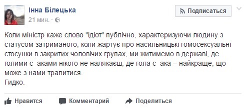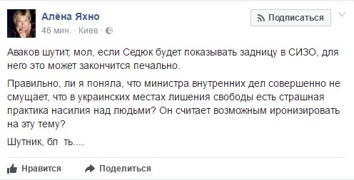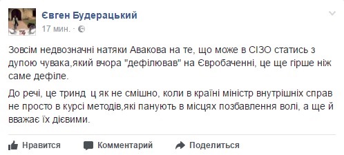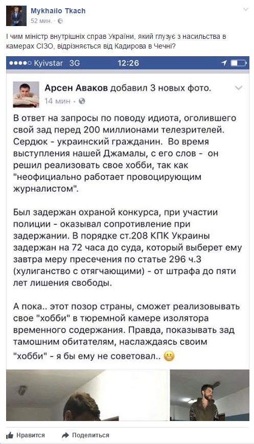 Українських журналістів обурив пост міністра внутрішніх справ Арсена Авакова, в якому він натякнув на насильство, якого може зазнати в ізоляторі тимчасового тримання пранкер Віталій Седюк, оголивший сідниці на Євробаченні.
