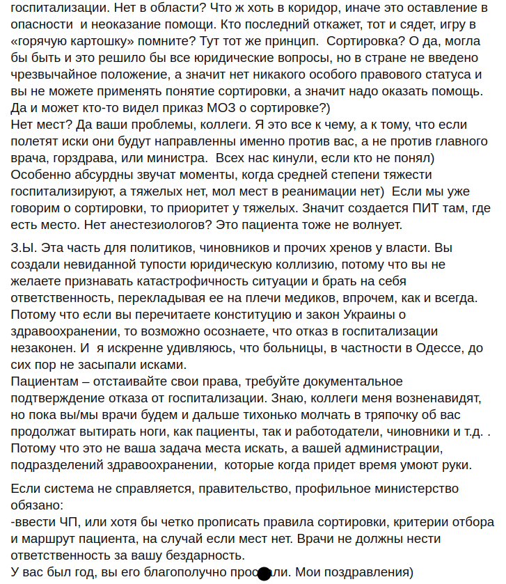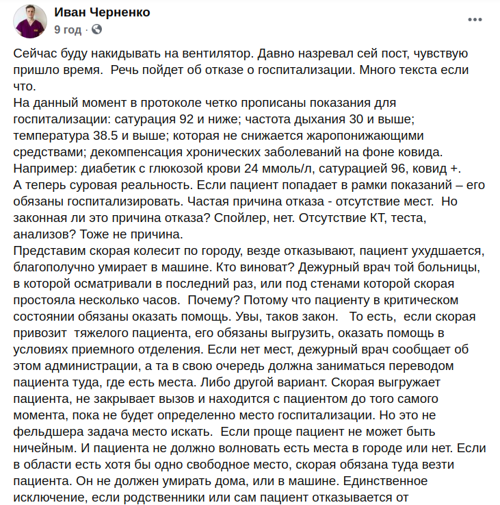 "Уявімо швидка їздить по місту, скрізь відмовляють, пацієнт погіршується, благополучно вмирає в машині. Хто винен? Черговий лікар тієї лікарні, в якій оглядали в останній раз, або під стінами якої швидка простояла кілька годин. Чому? Тому що пацієнтові в критичному стані зобов'язані надати допомогу. на жаль, такий закон. Тобто, якщо швидка привозить важкого пацієнта, його зобов'язані вивантажити, надати допомогу в умовах приймального відділення. Якщо немає місць, черговий лікар повідомляє про це адміністрацію, а та в свою чергу повинна займатися переведенням пацієнта туди, де є місця. Або інший варіант. Швидка вивантажує пацієнта, не закриває виклик і знаходиться з пацієнтом до того самого моменту, поки не буде визначено місце госпіталізації. Але це не фельдшера завдання місце шукати. Якщо простіше пацієнт не може бути нічийним. І пацієнта не повинно хвилювати є місця в місті чи ні...Нема місць? Так це ваші проблеми, колеги. Я це все до чого, а до того, що якщо полетять позови, вони будуть спрямовані саме проти вас, а не проти головного лікаря, міського відділу охорони здоров'я, або міністра. Всіх нас кинули, якщо хто не зрозумів", - зазначив лікар.