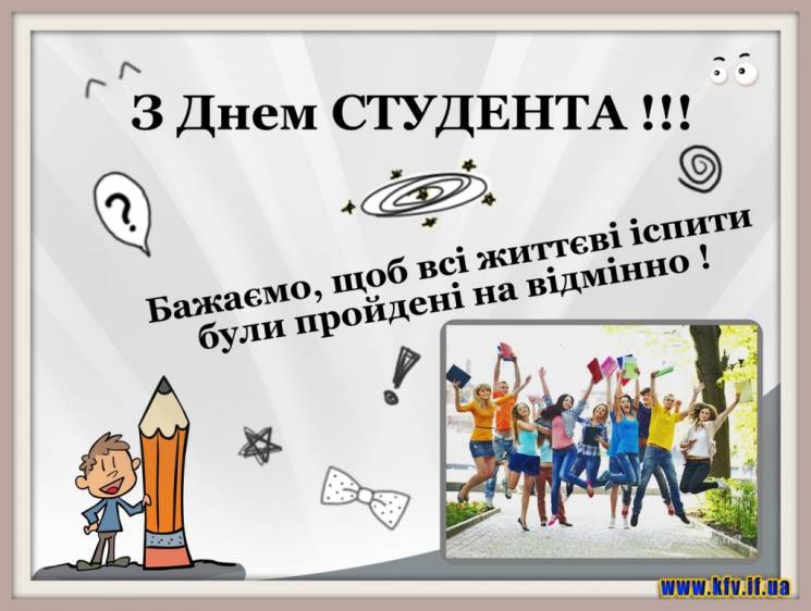 Вітаємо всіх студентів з бешкетним і веселим святом, з днем Студента! Бажаємо вам терпіння, працьовитості. Щоб знання давалися вам вільно і легко, і щоб ви змогли себе реалізувати в подальшому житті!