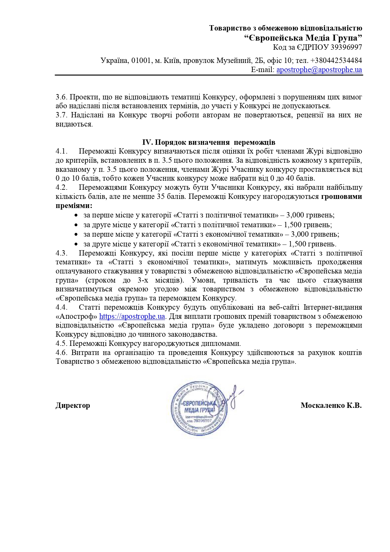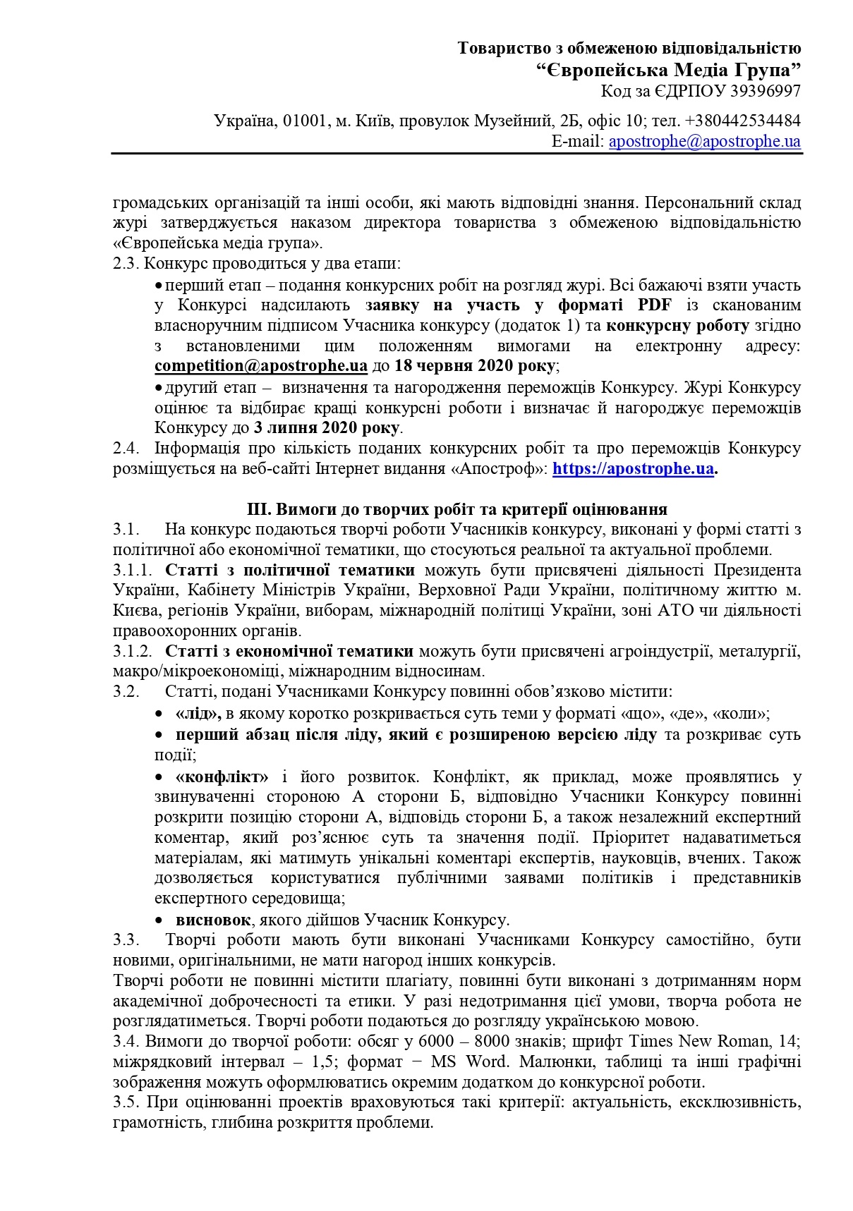Творчі роботи мають бути виконані учасниками конкурсу самостійно, бути новими, оригінальними, не містити плагіату та не мати нагород інших конкурсів. Переможці конкурсу отримають винагороди та можливість проходження оплачуваного стажування в інтернет-виданні "Апостроф" протягом 3 місяців.