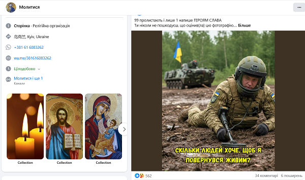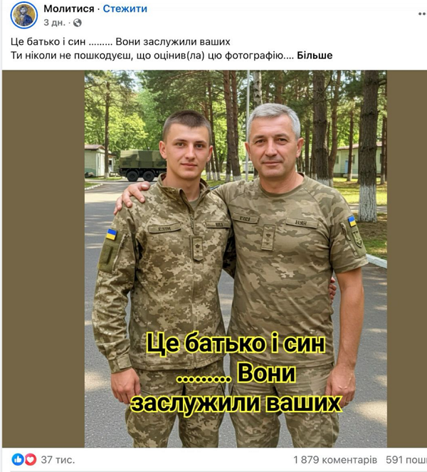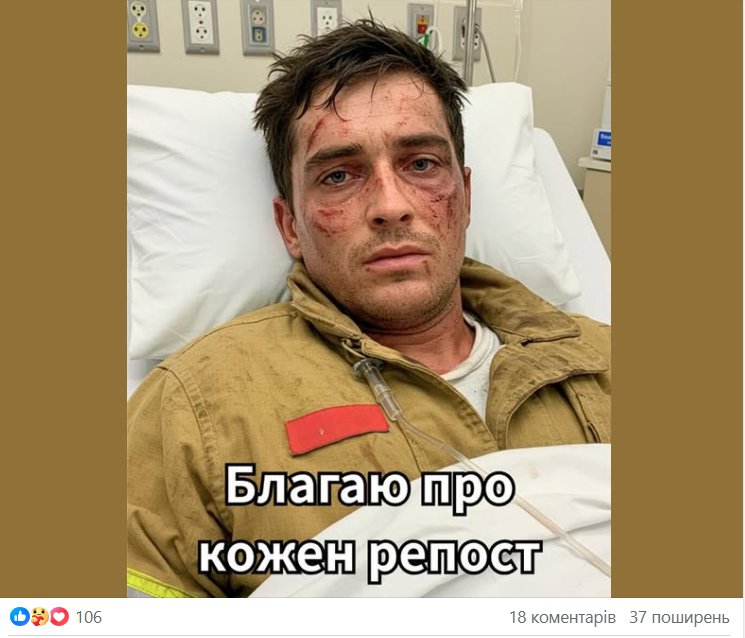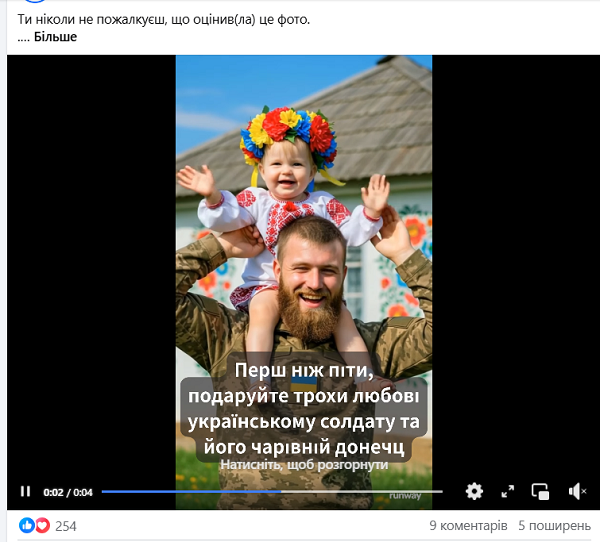 "В українському сегменті соцмереж шириться велика кількість дописів, які містять фото з явними ознаками генерації штучним інтелектом нібито українських військових, із закликами привітати їх чи то з днем народження, чи то з весіллям. Також є схожі дописи про врятованих тварин, дітей або літніх людей.