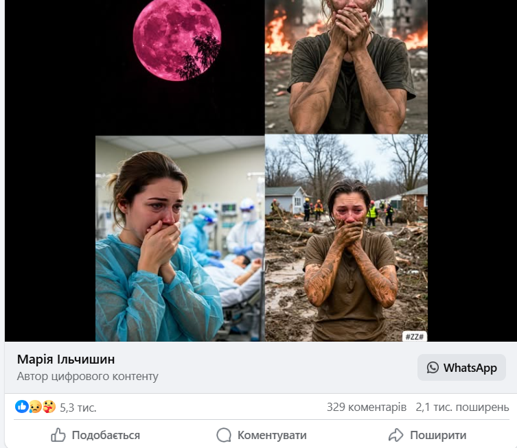 Ще один різновид шкідливих публікацій, згенерованих ШІ, – ті, що використовують, щоб накрутити лайки та зробити свою сторінку популярнішою. Часто це роблять завдяки емоційному контенту, який опосередковано впливає на вашу стрічку та вплітає до неї російську пропаганду.