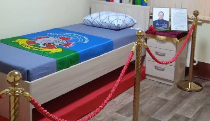 На кадрах - святково прибране ліжко, огороджене, як на цвинтарі. Прапори і фото, очевидно, загиблого військового з командного складу.