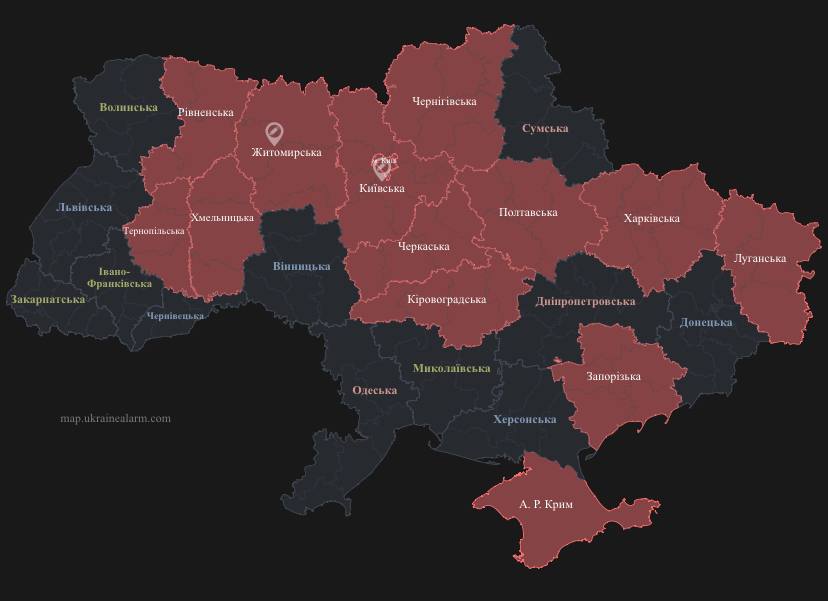 О 23:10 карта тривог дещо видозмінилась, зважаючи на переміщення безпілотників.