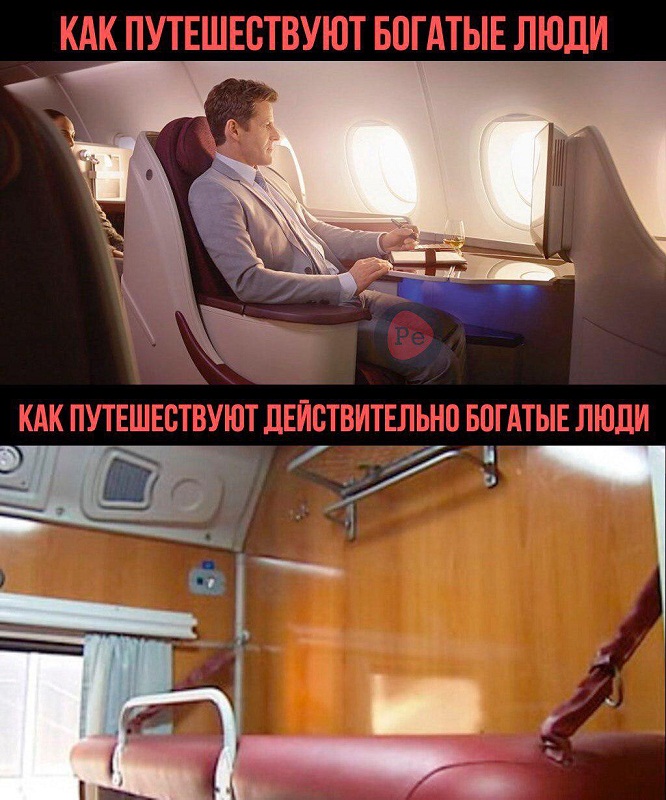 Так, на фото зображені пасажирські місця високого класу на борту літака з написом "як подорожують багаті люди" і ліжко в поїзді "Укрзалізниці" з написом "як подорожують дійсно багаті люди".