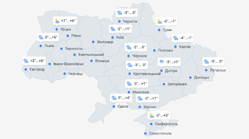 У західних регіонах країни денна температура повітря складатиме від -2 до +6 градусів. Суворіші погодні умови очікуються на сході та північному сході, де стовпчики термометрів протягом доби показуватимуть від -5 до -1.