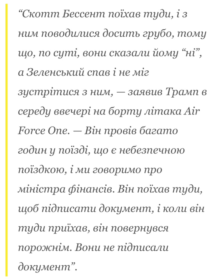 Український блогер Антон Ходза саркастично відреагував на поїздку в Україну міністра фінансів США Скотта Бессента, під час якої США були впевненні у підписанні угоди щодо доступу до критично важливих корисних копалин в Україні, та бурхливу реакцію Дональда Трампа на відмову.