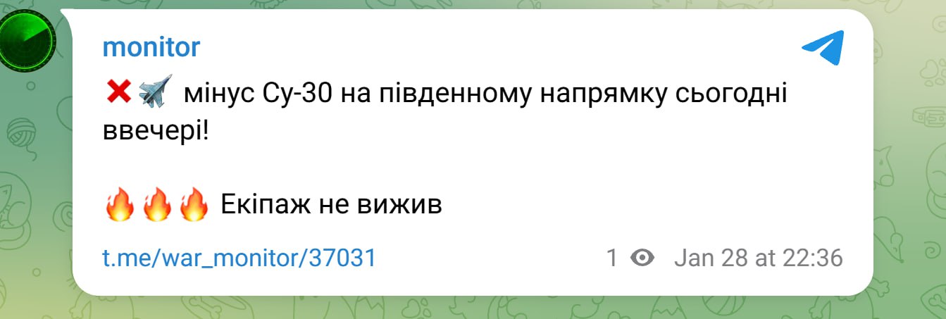 Згодом моніторингові пабліки повідомили, що ворог втратив ще один літак на південному напрямку. Попередньо, екіпаж не вижив, повідомляють у мережі.